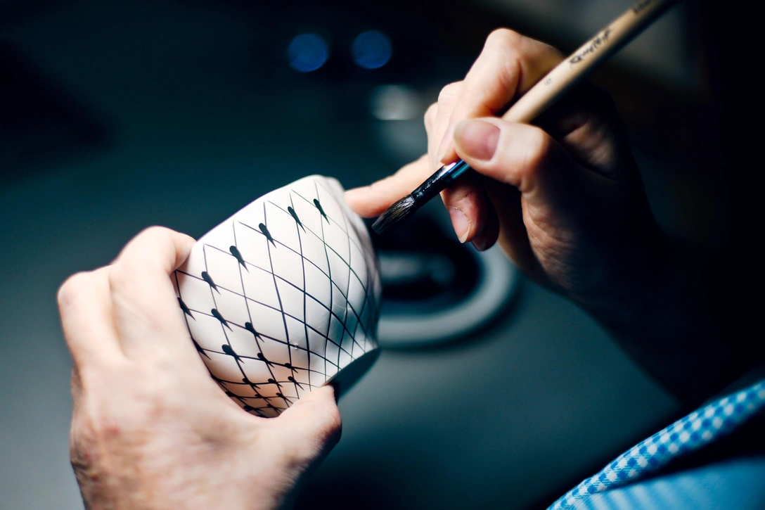 Обмакнув кисть в черную краску, живописец ловким движением руки наносит на пористый фарфор тонкие линии. Далее изделие покроют глазурью и отправят в обжиг, после которого рисунок обретет насыщенно-синий оттенок. Завершающий «штрих» — нанесение золотых узоров и финальный обжиг. Так рождается знаменитая «Кобальтовая сетка» Императорского фарфорового завода.