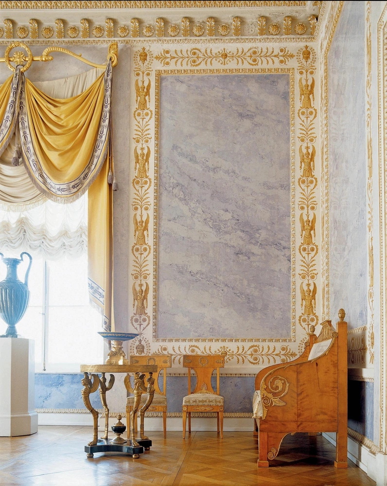 Для интерьеров эпохи ампир характерен яркий цвет. Для стен часто выбирали насыщенный синий, зеленый и красный (отличный фон для позолоченной мебели). Нежные акварельные оттенки голубого, фисташкового и сиреневого были не менее популярны. Потолки и падуги украшали гризайлью и белой лепниной.