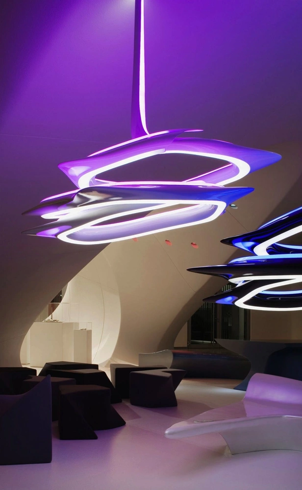 Светильники Aria и Avia, Slamp. Обтекаемые, невесомые формы из листов полимера создают ощущение постоянного движения.