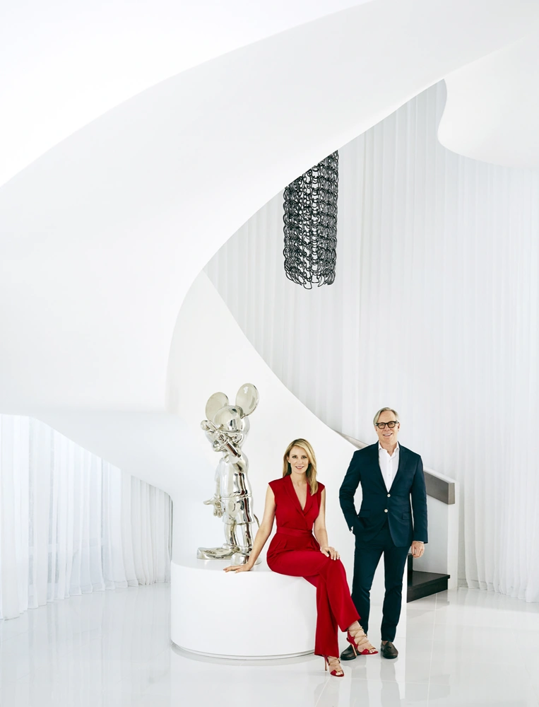 «Мы в восторге от всего дома, но если уж выбирать самую любимую комнату, пусть это будет гостиная, — говорит Хилфигер. — Специально для нее Мартин создал ковер в красных, фиолетовых и белых тонах: цвета перекликаются с палитрой работы «Новое пламя» Уорхола и Баскии, которая здесь висит. Для меня этот дом — не только жилье, но и своего рода арт-галерея. Искусство здесь всюду, даже на террасе рядом с бассейном мы поставили скульптуру Кита Харинга. Она там смотрится прекрасно! Ведь Майами — это не только модный курорт, но еще и культурный центр. Здесь есть, например, отличный Музей искусств имени Переса, один из моих самых любимых».