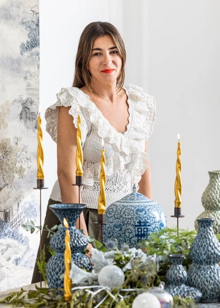 Для новогоднего декора дизайнер выбрала расслабленную и изысканную эстетику, избегая традиционных красных и зеленых оттенков. В основе ее концепции — комбинация текстиля со свечами и цветочными композициями в тон. Ее дом в Бильбао в этом году демонстрирует лаконичное Рождество, выдержанное в синих, серебряных и золотых цветах с обилием растительного декора.