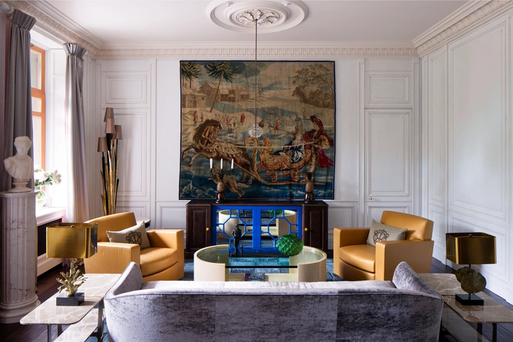 Гостиная в проекте декоратора Ирины Дымовой. На стене — огромный фламандский гобелен XVIII века, галерея Boccara. «Это „Зимние игры“, королевский заказ, между прочим, — поясняет Ирина. — Его автор, Лодевейк ван Шоор, был одним из самых известных художников, создававших эскизы для гобеленов на рубеже XVII–XVIII веков. На этом изображены король Франции Людовик XV с супругой, урожденной Марией Лещинской, катающиеся по льду в санях».