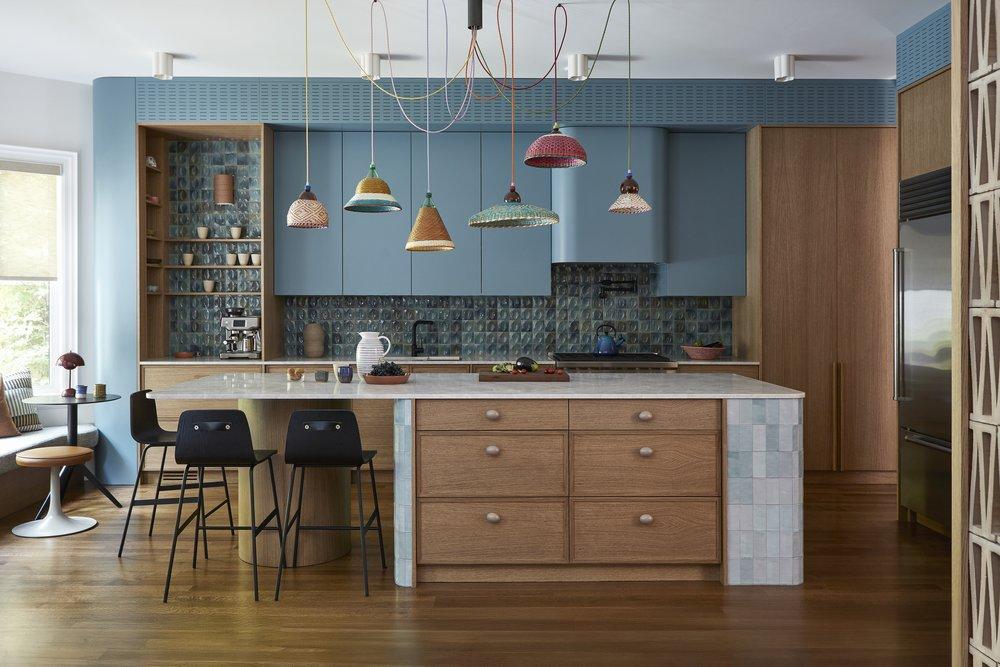 Очень светлый, почти телесный персиковый и насыщенный синий. Синий добавляет глубины, а персиковый — мягкости. Такое сочетание прекрасно работает в современном интерьере кухни или столовой;
