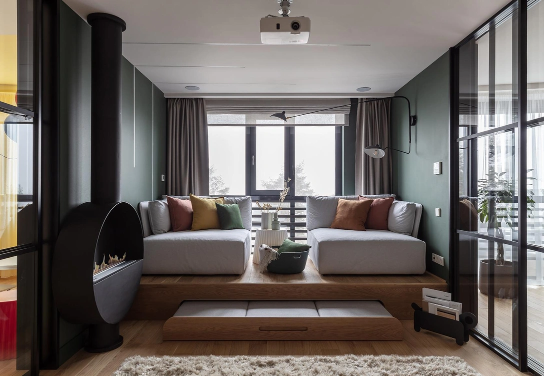 В одном из проектов домашний кинотеатр оказался идеальным местом для использования подиума. Мы не стали превращать его в зону хранения, как это делают обычно. Вместо этого в конструкцию подиума встроили мягкие выдвижные модули: миниатюрные пуфы, которые можно легко выкатить для дополнительных посадочных мест. Такое решение помогло создать уютную атмосферу, добавило интерьеру рельефности. Подиум стал функциональной деталью и эффектным визуальным акцентом.