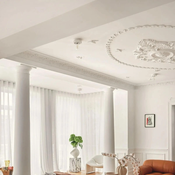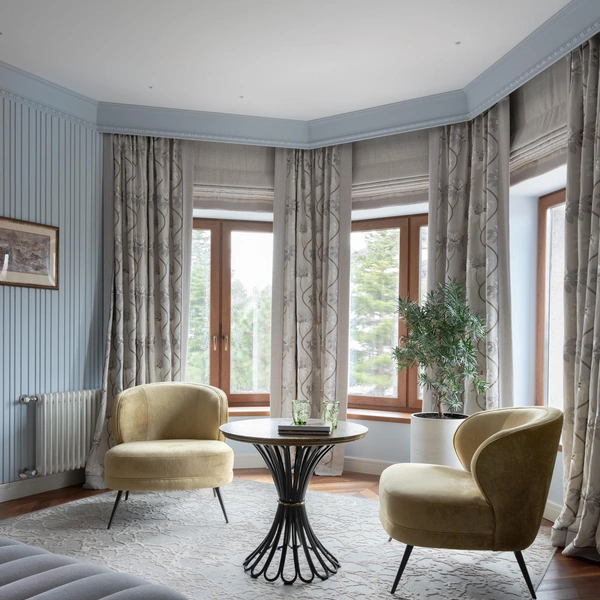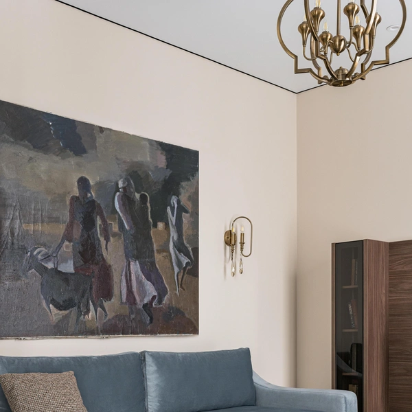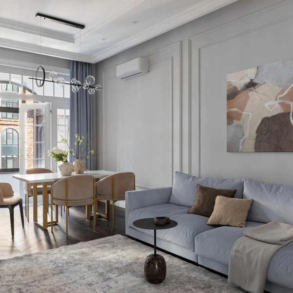 И, кстати, не забывайте, что у вас всегда есть пятая стена — потолок. Представьте, как красиво на нем будет смотреться этот нежный оттенок — будто открылось бескрайнее небо. А еще серо-голубой, несмотря на свою мягкость, может стать хорошим акцентом, если выделить им молдинги, плинтусы, карнизы, лепнину. Отличный вариант для современной классики!