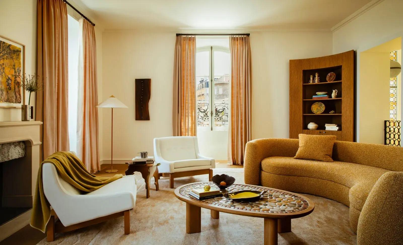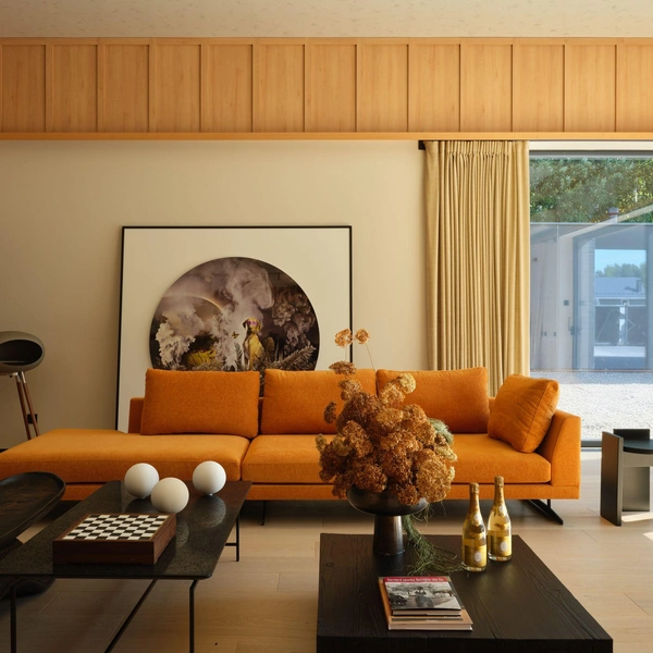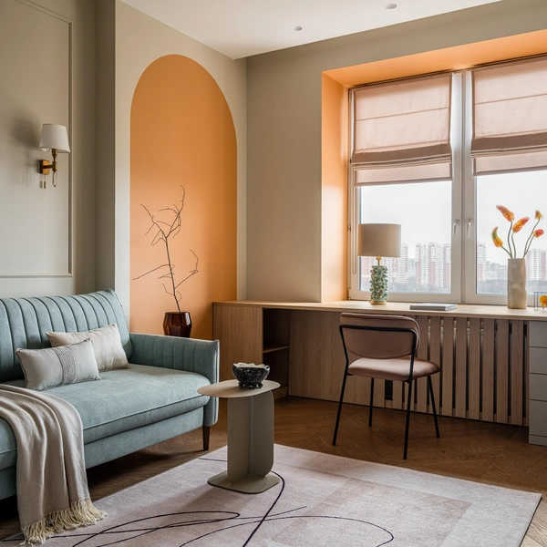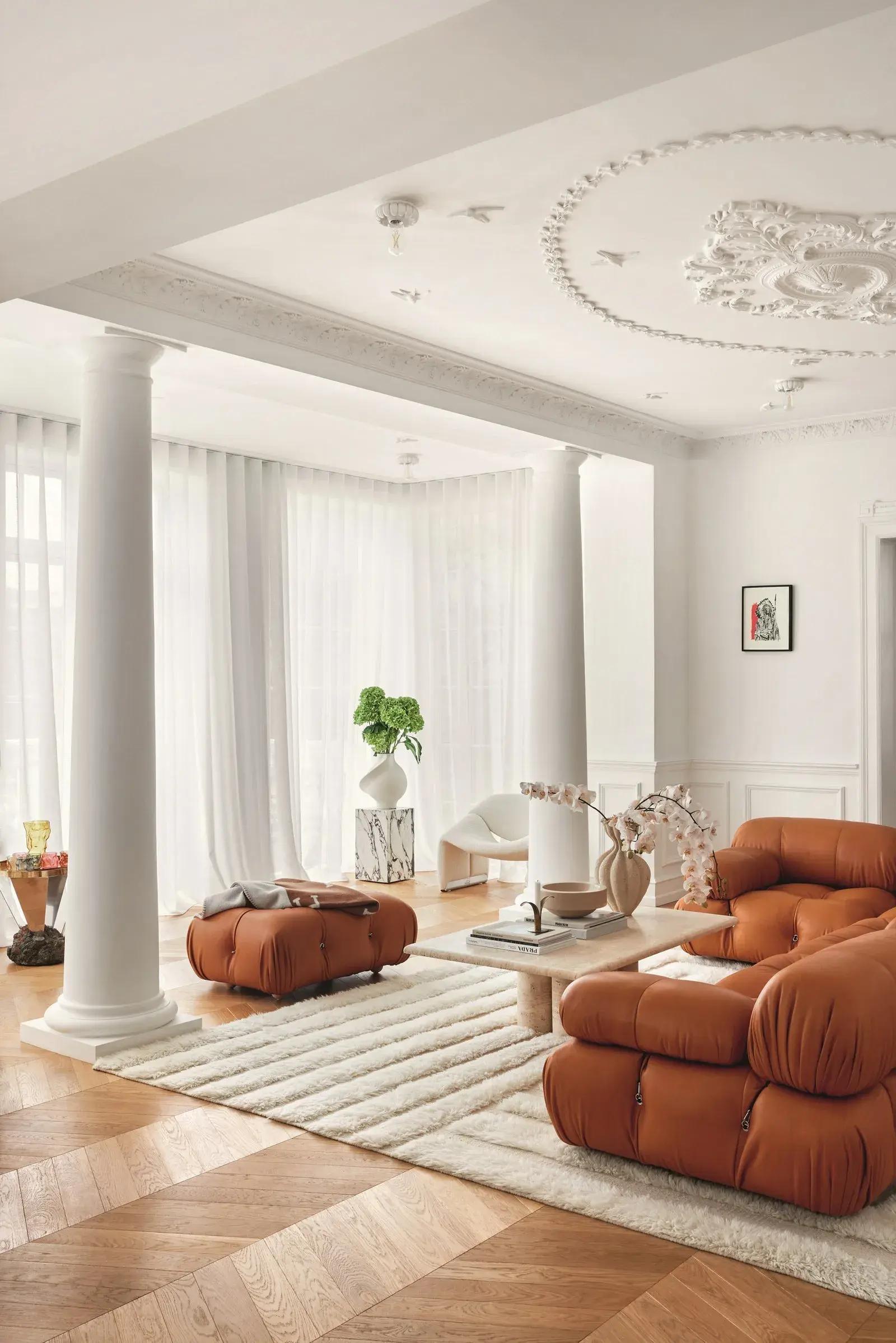 Оранжевый — это, пожалуй, самый яркий и солнечный цвет в нашей подборке. Он может быть разным — более пастельным, ближе к светлой терракоте, а может быть насыщенным, ближе к красному. Он подойдет для выделения акцентной зоны: если вы выбрали яркий оттенок, советуем применять его дозированно. Например, на шторах, обивке, пледах, подушках. А если цвет более спокойный и пастельный, им можно выкрасить даже потолок. Но лучше всего разбавлять его более нейтральным — к нему отлично подойдут оттенки молочно-белого или желтого, в духе соломенного или оттенка сливочного масла. Этот цвет приживется прежде всего в современном интерьере. Впрочем, его примет и неоклассика — там оранжевый будет выглядеть неожиданно.