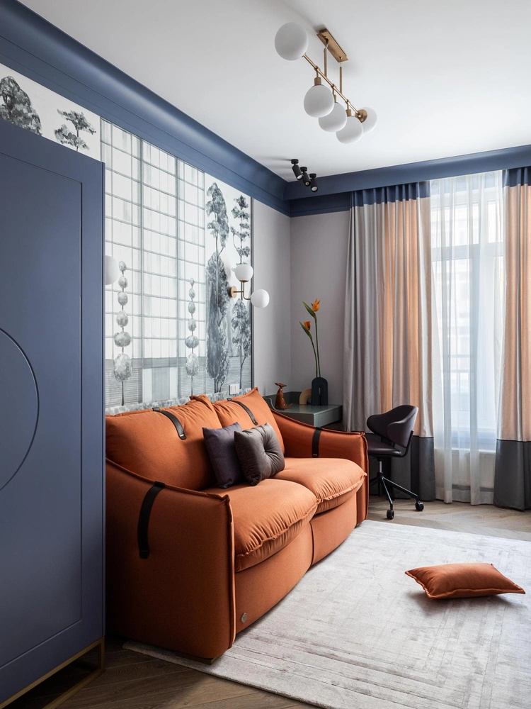 Традиционно фиолетовый цвет ассоциируется с печалью и подавленностью, однако дизайнеры и психологи с этим не согласны и считают, что правильно подобранный в интерьере оттенок способен снижать уровень тревожности и стресса. Играя в одном ансамбле с ярким, летним оранжевым цветом, фиолетовый делает пространство интересным и выразительным. Оранжевый — это очень позитивный цвет, он дает заряд бодрости, наполняет душу беззаботностью и радостью. Дизайнеры советуют использовать его дозированно: в предметах мебели, декоре или текстиле. В ином случае есть риск создать слишком активный интерьер, в котором сложно будет долго находиться. Использование смелого сочетания фиолетовых и оранжевых оттенков требует тонкого чувства цвета: важно грамотно подобрать цветовой подтон и насыщенность. Однако если вы успешно справитесь с этой задачей, интерьер получится по-настоящему уникальным и эффектным.