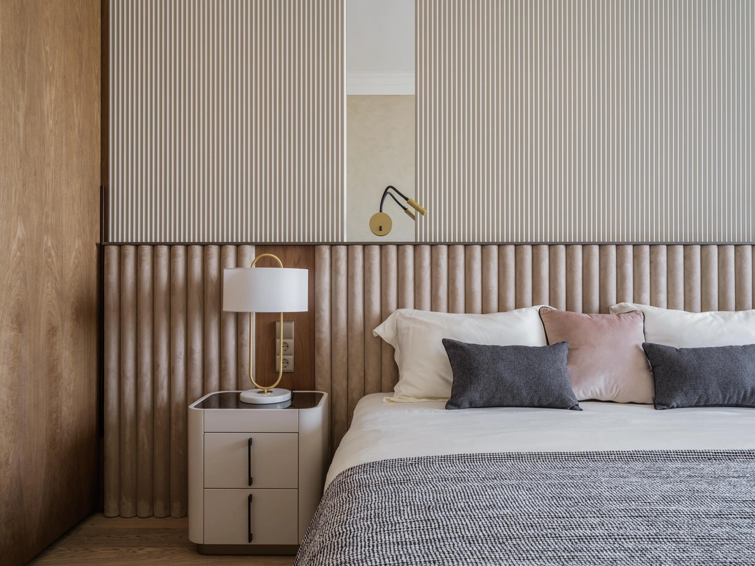 Квартира в Белгороде. Проект Елены Безбородовой. В этом проекте мягкое изголовье из вертикальный «трубок» дополнено деревянными панелями и узким зеркалом.