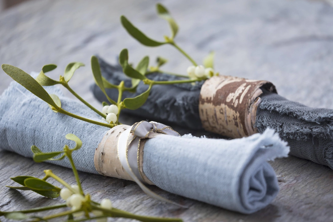 Идеальный вариант для классической сервировки. Скрутите салфетку в рулон, после чего перетяните ее тесьмой и украсьте еловой веточкой, цветком или крылышками ангела из перышек.