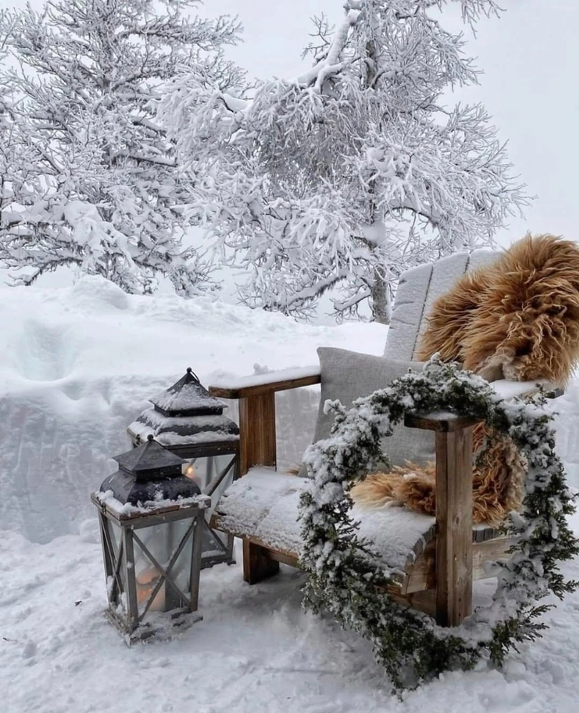 Декор из сухих веток, хвои и других природных элементов — простой и элегантный способ украсить террасу. Для освещения лучше дополнительно использовать переносные фонари, которые можно легко выставить на улицу, когда это нужно, а ночью убрать.