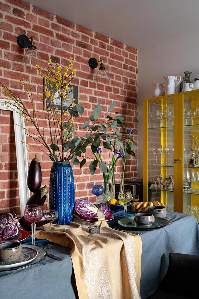 «Мы с Артемом и хозяйкой квартиры Марией Перцевой совпадаем в любви к необычным вещам, винтажу, коллекционным предметам декора и мебели, цвету, сервировке и искусству, поэтому нам захотелось пофантазировать и переосмыслить привычный взгляд на сервировку праздничного стола, — рассказывает Элина — А Мария с радостью поддержала нас и посодействовала нам в этом деле, любезно предоставив инвентарь и свою квартиру».