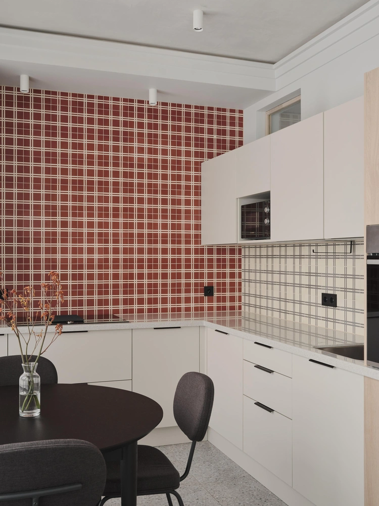 Фартук на стене, где расположен кухонный гарнитур, — первое, что будет бросаться в глаза при входе на вашу кухню. Поэтому его оформлению стоит уделить особое внимание. Дизайнеры настоятельно советуют не экономить на материалах, тем более, что речь идет всего о нескольких квадратных метрах. Если ваша кухня выполнена в спокойной гамме, яркий кухонный фартук станет эффектным акцентом. Можно оформить стену плиткой с активным геометрическим узором или же выбрать однотонный вариант, но в яркой гамме. Насыщенный синий, изумрудный, бордовый, ржаво-коричневый, золотой — все эти цвета хорошо смотрятся на кухне, тому пример — наша подборка проектов российских и зарубежных дизайнеров.