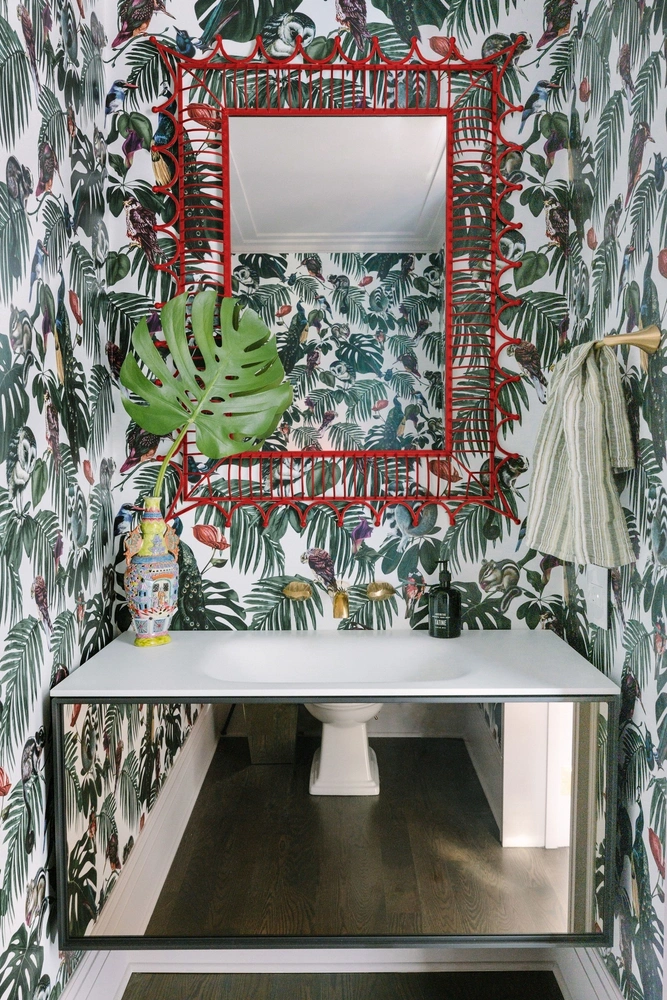 Обратите внимание на красную тумбу со встроенной раковиной. В магазине вы такую не найдете, зато сможете сделать ее самостоятельно. Это совсем не сложно. Главное, при изготовлении короба принимать в расчет размер плитки, которой вы будете его облицовывать — именно в этом кроется залог успеха.