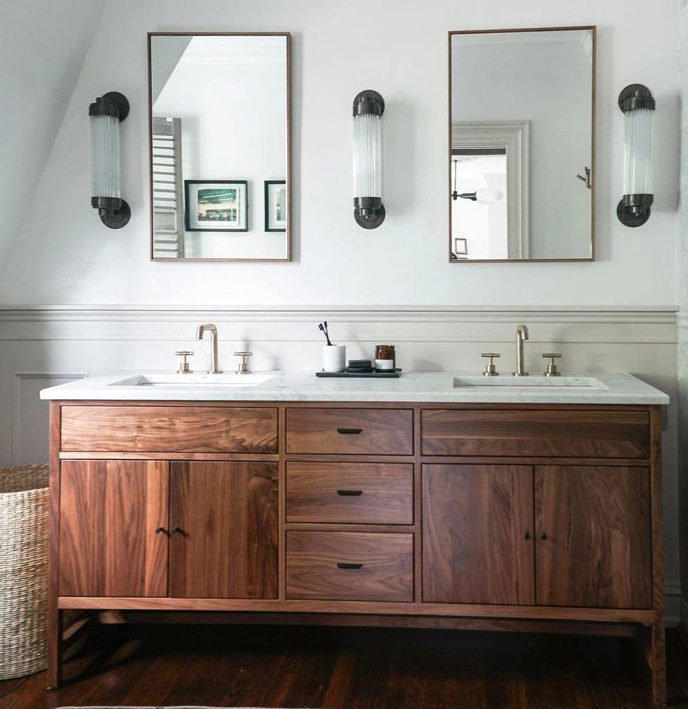Чтобы добавить ванной комнате в деревенском доме шика, нужно совсем немного — поставить отдельно стоящую ванну, повесить большую люстру и добавить зеркал. И вам не захочется отсюда уходить.