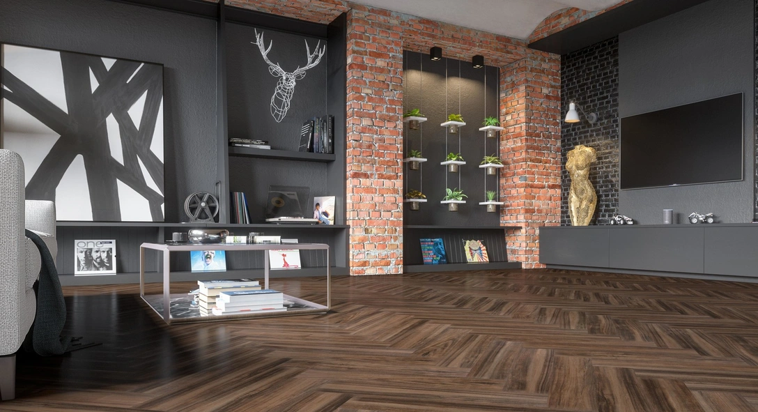 Внешне кварцевый ламинат не отличим от деревянного паркета или каменной кладки, а количество доступных вариантов позволяют использовать его в любых интерьерах. При этом материал тактильно приятный — по такому полу хочется ходить босиком.