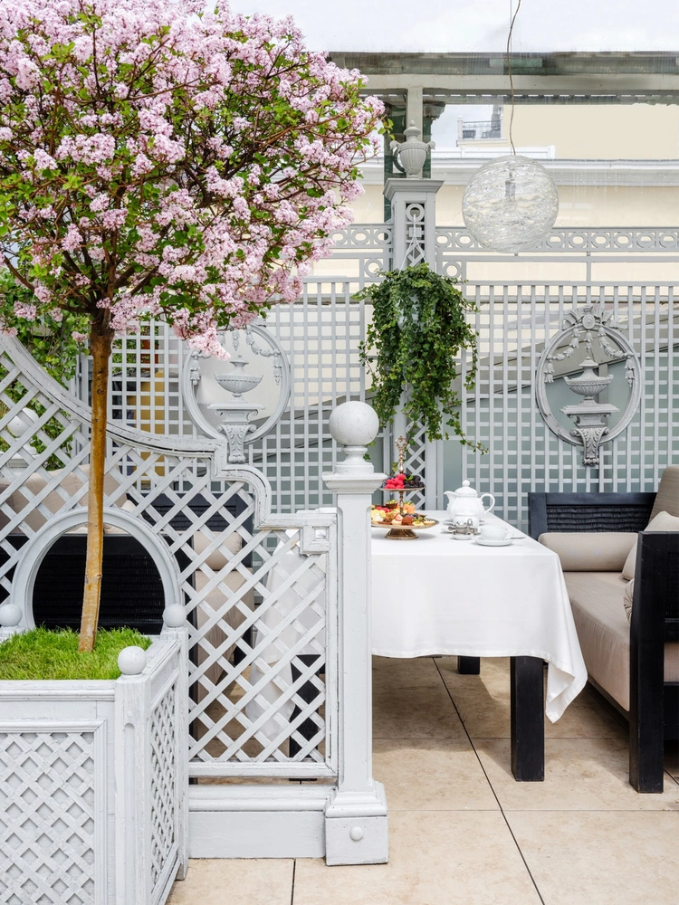 Увидев будущую террасу, я понял: это райское место. Ну а Эдем — это сад. Классическая архитектура здания потребовала трельяжей с розариями, вазонами и колоннами. Они невероятно красивые, легкие и практичные. Этот дизайнерский элемент отсылает нас к эпохе Людовика XIV, с его именем связывают возрождение трельяжных решеток для вьющихся растений в саду. Хотя возникли они еще в Древнем Риме.