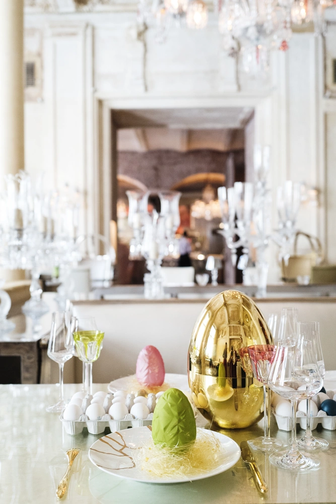 Поскольку Пасха известна как праздник светлый и чистый, прозрачное стекло и тончайший хрусталь идеально подойдут для этого случая. Не стесняйтесь комбинировать фарфор из разных комплектов, смешивать классический сервиз с чем-то более современным и лаконичным. Добавьте свежие цветы — желательно белые: отлично будут смотреться тюльпаны или срезанные пышные шапки пионов. Блеск столового серебра добавит композиции особый шарм. Эффектно на таком столе будет смотреться серебро с авторской гравировкой. Один из старейших во Франции производителей столового серебра мануфактура Christofle выпустила коллекцию Mood — это набор посеребренных столовых приборов на шесть персон в компактном изящном кейсе в форме яйца. Идеальный вариант для Пасхи.