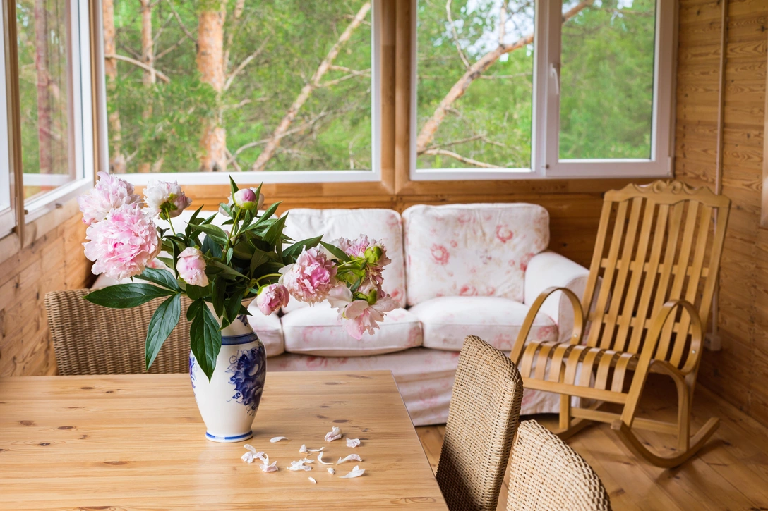 Повесьте на веранде легкие шторы, защищающие от солнечных лучей, но пропускающие свежий воздух. Сквозняки здесь не страшны!