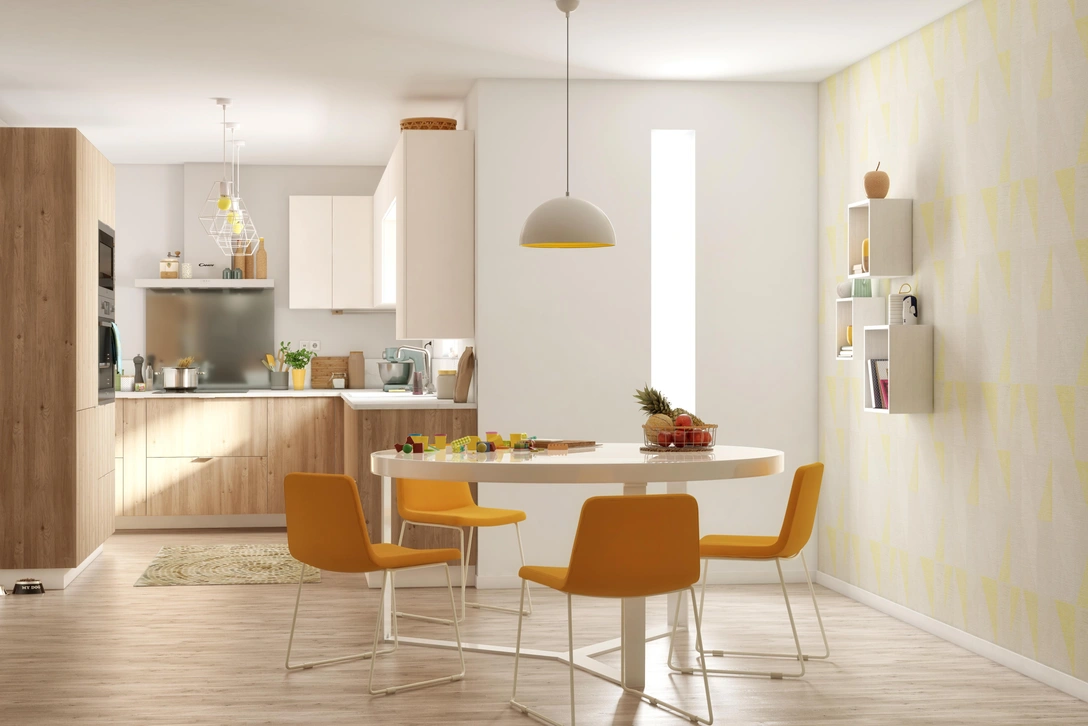 Напольное покрытие в зоне кухни должно быть легким в уборке и влагостойким — так вы точно не будете беспокоиться о просыпанных специях и пролитых жидкостях. Избегайте гладких покрытий, предпочтительнее слегка шероховатая фактура, на ней ниже риск поскользнуться. Истираемость и устойчивость к физическому воздействию — еще две важные характеристики, на которые нужно обратить внимание, если у вас большая семья, особенно с домашними животными, или вы много готовите. В первом случае по полу просто ежедневно передвигается множество ног и лап, двигается мебель, создавая постоянную нагрузку на покрытие. Во втором — жир, пар, мелкие крошки, которые образуются в процессе частой готовки, требуют более частой уборки. Если для вас критично поддерживать относительную тишину во время нахождения на кухне, выбирайте старый добрый линолеум или более современный кварцвинил. Они более мягкие и приглушают звуки шагов или упавших предметов, но менее износостойкие, чем кафельная плитка или керамогранит. В больших кухнях или студиях можно комбинировать разные напольные покрытия, чтобы зонировать помещение.