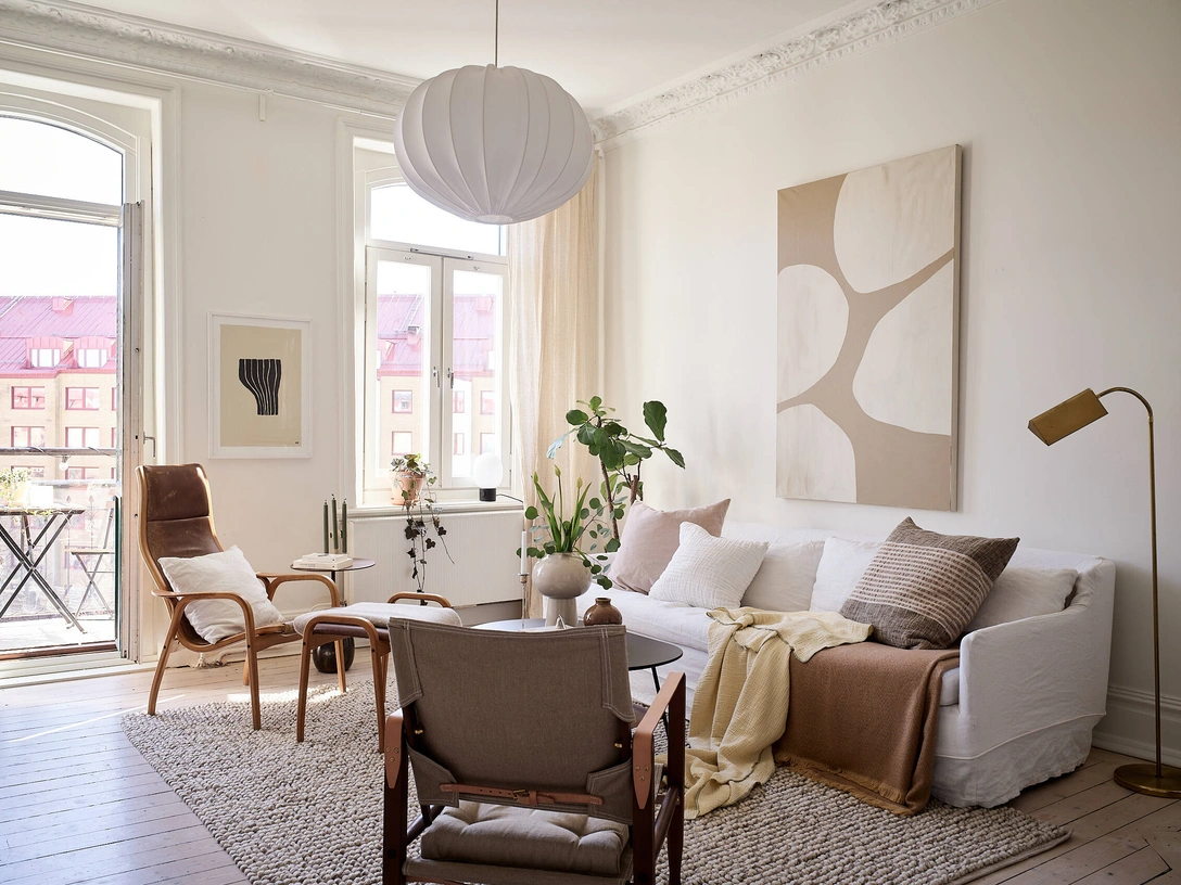 Помощник номер один — это нейтральная база. Лучше всего, если в основе интерьера лежат спокойные природные оттенки: светло-серые, бежевые, песочные, белые или пастельные тона. При этом можно (и нужно!) использовать разные фактуры, которые помогут сделать пространство более глубоким, динамичным, многослойным и актуальным на долгие годы.