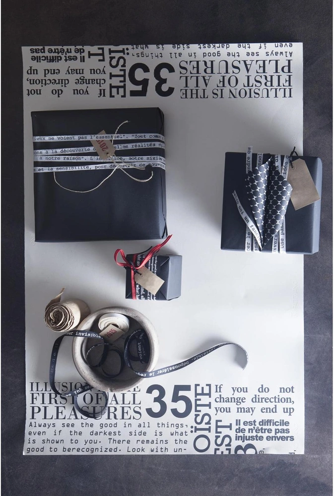 «В данный момент две главные темы, которые нам интересны, — шрифты и сложные орнаменты. Напечатанный на белом листе при помощи трафарета алфавит (неважно — английский, итальянский или русский) сам по себе выглядит красиво — это уже готовая упаковочная бумага. Однако можно пойти дальше и перенести на упаковку цитату из книги или фильма, любимое философское изречение».