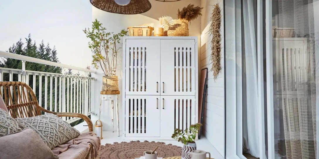 В небольшом пространстве важно поддерживать визуальную чистоту, чтобы все лишнее было убрано с виду. Для хранения на балконе отлично подходят сундуки и скамьи со встроенным ящиком для хранения под сиденьем. Туда можно сложить все мелкие предметы, которые зрительно захламляют пространство, а также прятать пледы и подушки.