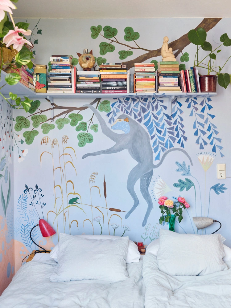 Не у всех есть возможность расписать стены? В этом случае можно использовать обои с принтами или панно: тропические джунгли, экзотические цветы и животные — все это будет отлично смотреться в комнате (особенно, если дополнить все это текстилем и аксессуарами).
