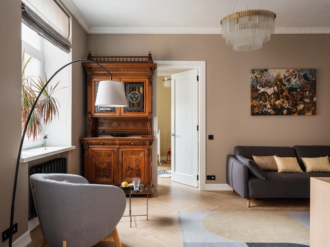 В квартире, где последний ремонт был сделан в год постройки дома, удалось многое сохранить: высокие потолки, гипсовые розетки, чугунные радиаторы, дверные проемы высотой 2,3 метра. Что не удалось оставить, трактовали по-новому: старый паркет был в плохом состоянии, его заменили на ламинат в виде английской елки; потолочные карнизы, которые обрушились на этапе выравнивания стен, заменили на модели из полиуретана.