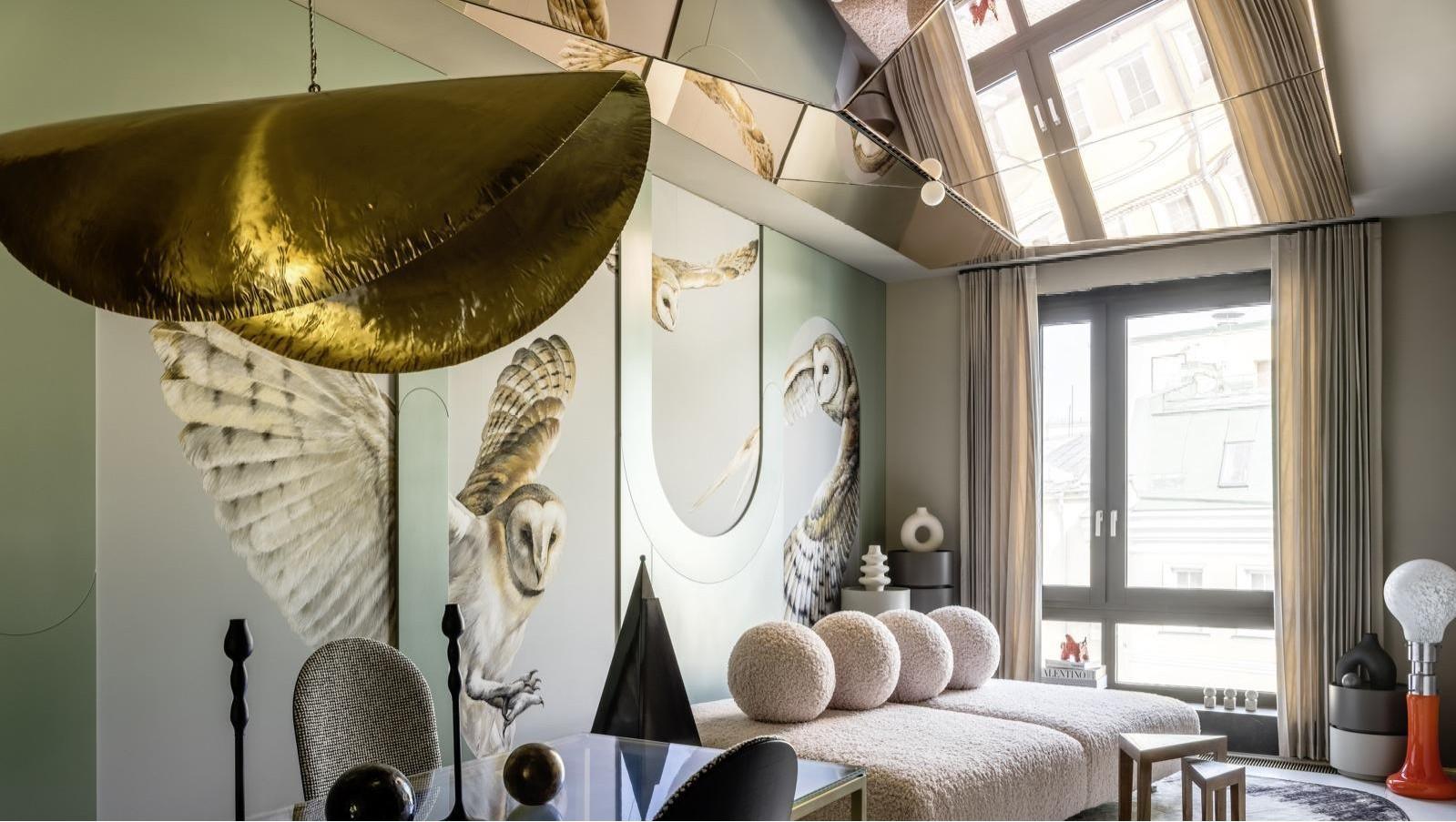 Проект Жана-Луи Деньо. Узор-спираль, нарисованная на потолке вручную, заставляет его казаться выше и придает интерьеру комнаты динамику.
