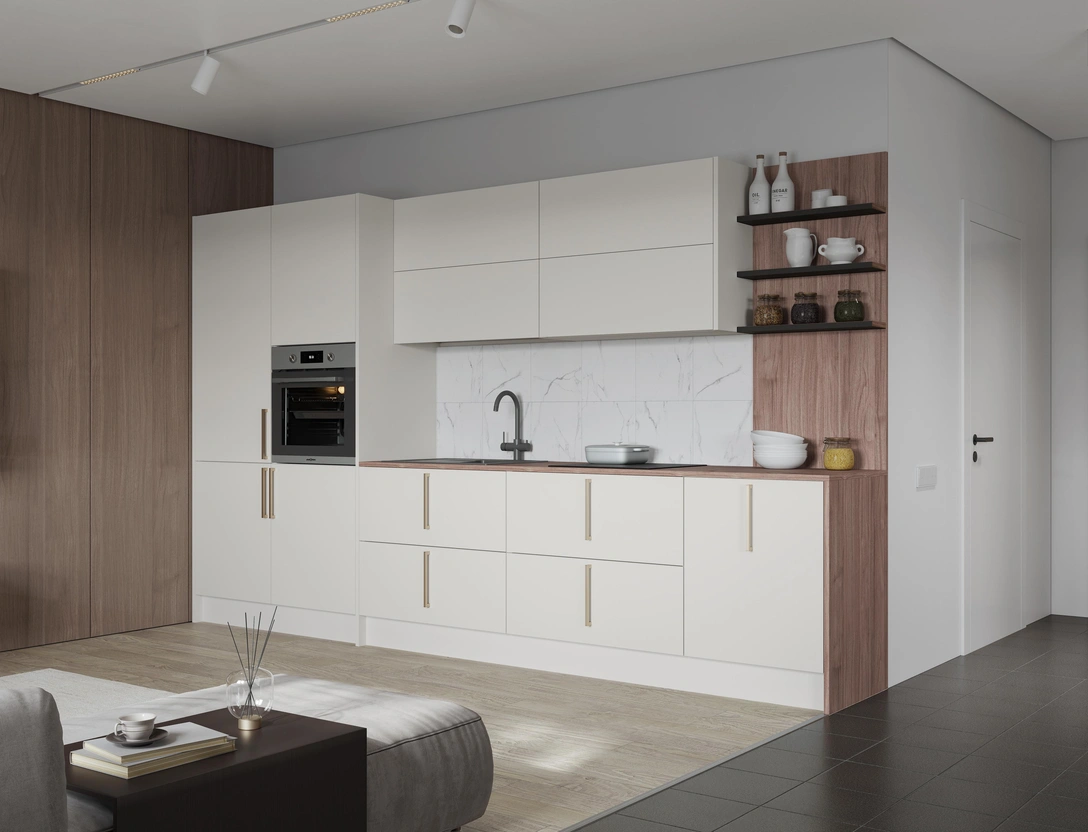Поверхности должны быть приятны на ощупь — тактильные материалы делают интерьер многогранным и интересным. Фасады с отделкой Soft Touch имеют приятную бархатистую фактуру. За таким покрытием легко ухаживать, на нем незаметны отпечатки пальцев, брызги и разводы.