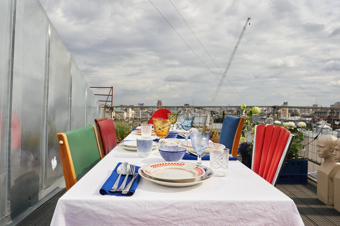 Там у Дарьи организована двухуровневая открытая терраса, которая является буквально частью крыши — с бетонными стенами с подтеками и железными, временами ржавыми, перилами в окружении серых стальных крыш. Для этого пространства Дарья выбрала стилистику, отсылающую к уличным кафе и барам, которые с одинаковым успехом можно встретить в Берлине, Нью-Йорке, Стамбуле, Тбилиси и других точках земного шара.