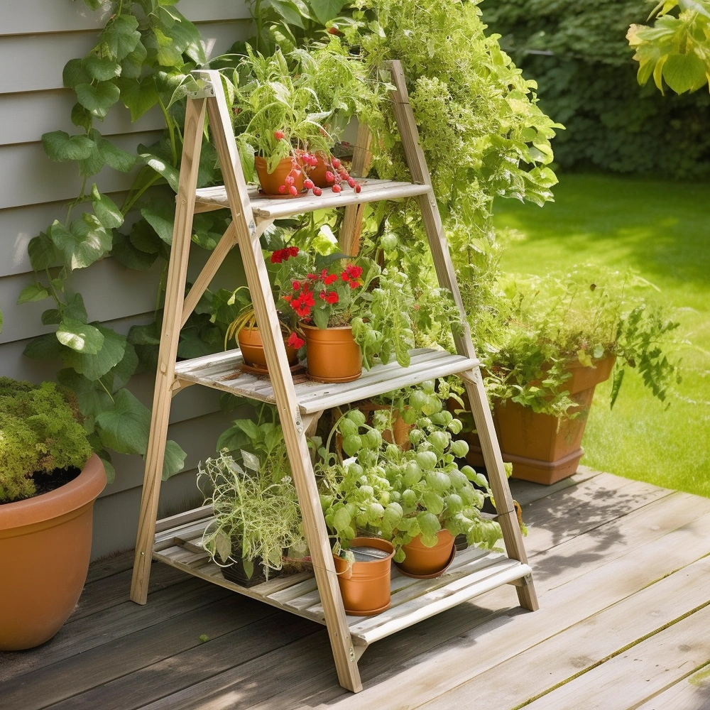 Стремянка или старая лестница — отличная шпалера для маленького участка или балкона. На огороде под ней можно даже организовать небольшую компостную кучу, скрыв ее тем самым от посторонних глаз разросшимися растениями.