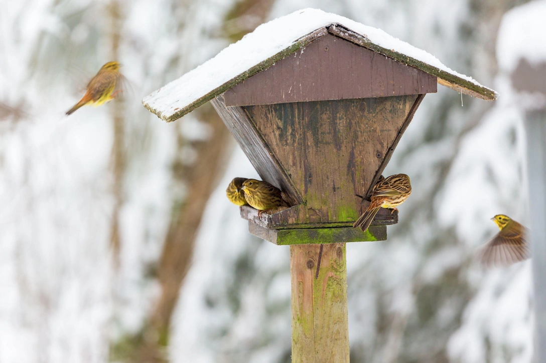Подкармливать птиц нужно с наступлением холодов — с ноября по март. Лучше всего использовать для этого кормушки, которые можно приобрести в магазине либо соорудить своими руками. В этом случае их нужно делать из натуральных материалов, предпочтительно дерева. Отверстия в кормушке должны быть небольшими, чтобы туда не проникали крупные птицы (например, голуби) и не отнимали корм у маленьких пернатых.