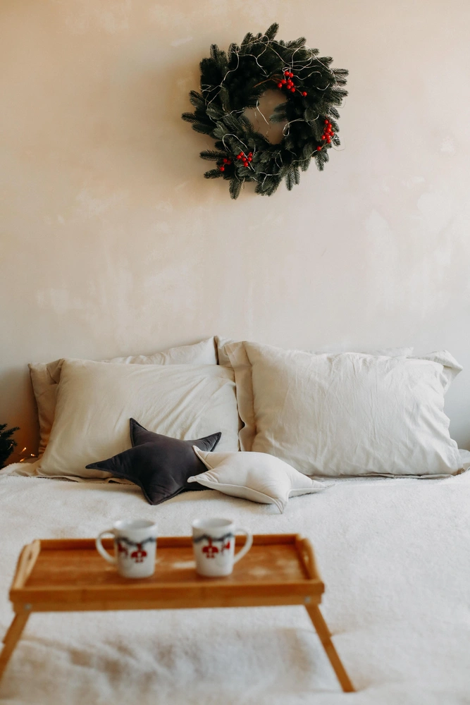 Когда весь дом преображается к празднику, самое время повесить у кровати рождественскую звезду. Она может быть обычной, из плотной бумаги, а может быть со встроенной подсветкой: последний вариант атмосфернее и сразу поможет наполнить вашу спальню волшебством Рождества. Как вариант, можно поставить у кровати подсвечник с настоящими свечками или электрический светильник-семисвечник.