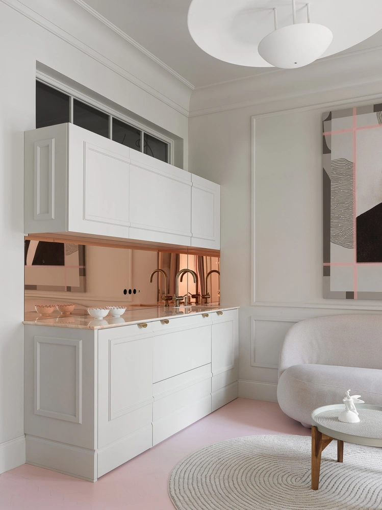 На белом фоне отлично смотрятся яркие акценты (они балансируют друг друга), необычные детали, дизайнерская мебель или предметы искусства. Лимонный или бирюзовый фартук, розовая или латунная столешница, красные и оранжевые стулья — эти яркие сами по себе объекты на белой кухне становятся настоящим центром притяжения, от которых просто невозможно отвести глаз. «Белый — хороший помощник в том случае, когда нужно объединить в одном пространстве на первый взгляд несовместимые вещи. Он „аннулирует“ идентичность предметов, объединяя их общей идеей», — считает Катерина Виноградова, основатель RE architectural studio