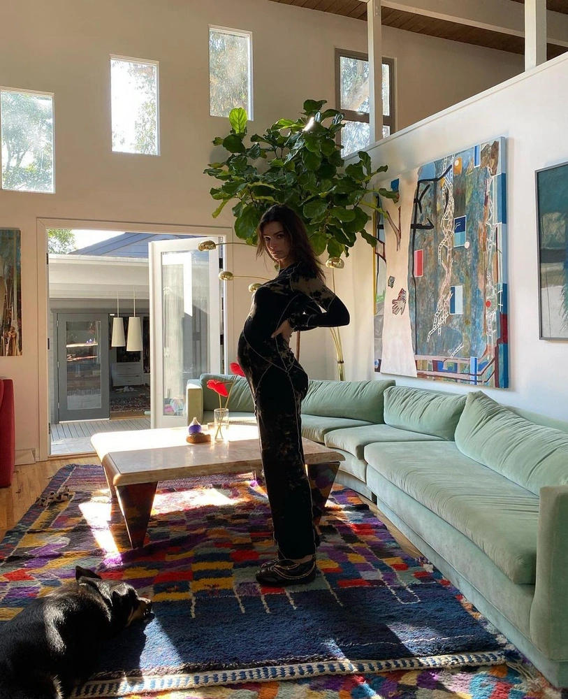 Кстати, обратите внимание на ковры — похоже, яркие принты постепенно вытесняют минималистские тенденции. Люди устают от чересчур спокойных и «пресных» монохромных помещений и хотят добавить им «перчинки» в виде цвета, орнаментов или декора, в каком-то смысле вспоминая моду 1960-1970-х. Правда, гостиную Ратаковски вряд ли можно назвать максималистской — в ней как раз все в меру и ничего чересчур. Так что если вам захотелось сделать энергичный интерьер, но на отчаянные эксперименты вы не готовы — берите пример с Эмили и начните с акцентных ковров и картин.