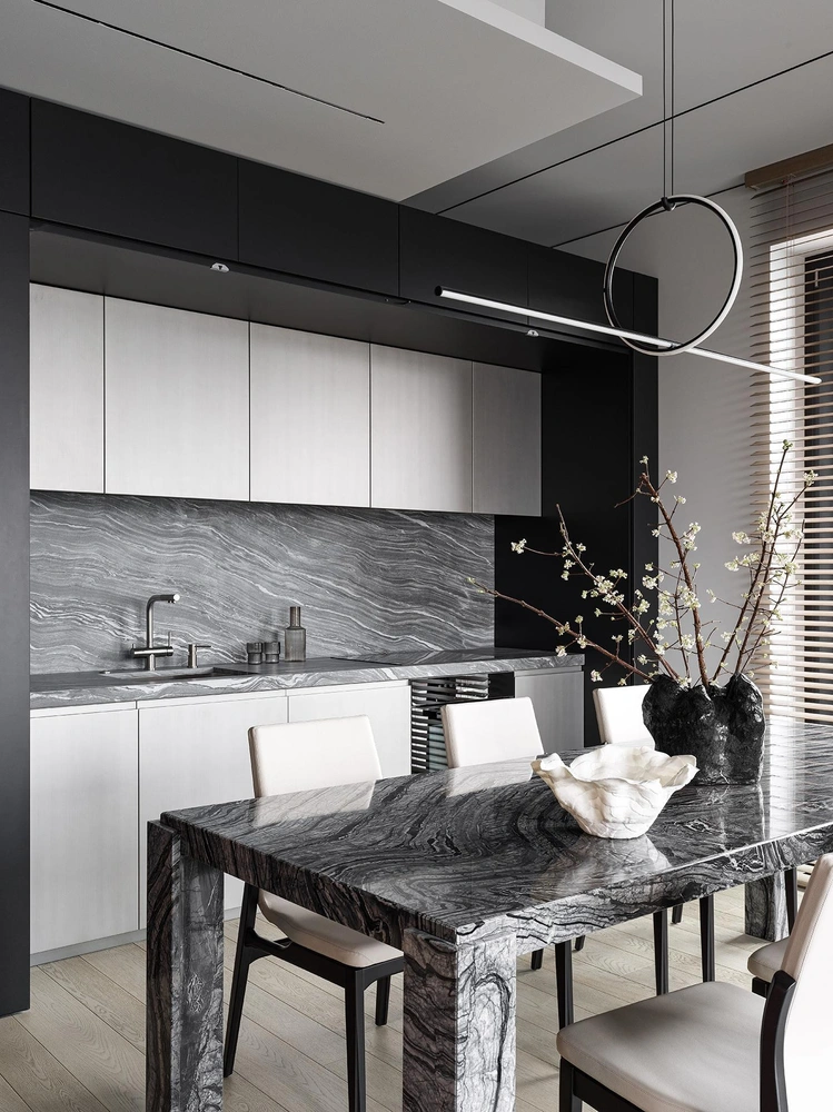 Взять хотя бы интерьер кухни: здесь вы можете сочетать шкафы черного и белого цвета, причем в белый, как правило, красят верхние навесные модули, тогда как в черный — нижние. В таком варианте кухня выглядит визуально легче. Другой, не менее популярный вариант, — сделать всю кухню белой, а столешницу и фартук изготовить из черного камня. Такое сочетание позволяет создать ощущение объема и придать пространству дополнительную глубину. И, наконец, еще одно эффектное решение — украсить белые кухонные фасады тонкой графичной линией, черной фурнитурой или сантехникой. Здесь мы собрали для вас вдохновляющие примеры из проектов российских и зарубежных дизайнеров. Листайте нашу подборку и черпайте вдохновение для оформления своего дома!