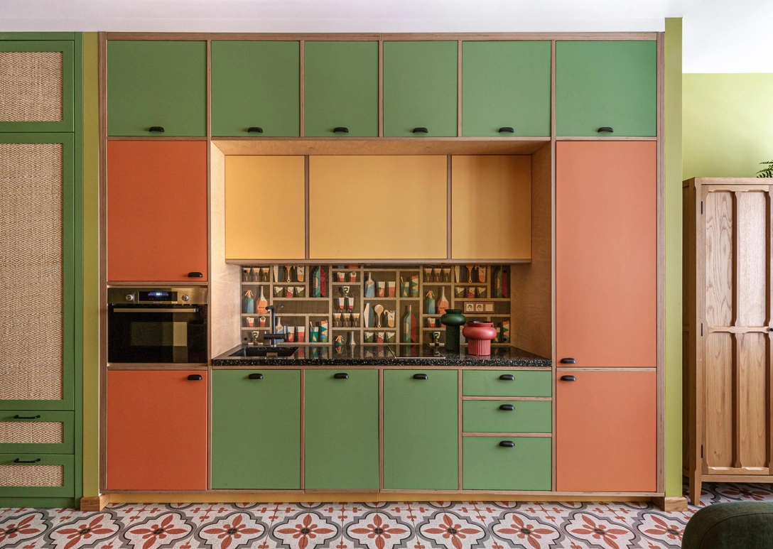 Еще одно поле для эксперимента — кухонный фартук. Для него подойдут самые неожиданные материалы — например, стеклоблоки. Они могут вписаться в стиль лофт. Кроме того, они отлично моются и создают особый свет — особенно если ваша кухня «граничит» с ванной, например. Можете попробовать любую зеркальную поверхность — она также хорошо моется, но при этом в той же степени маркая. Более классический вариант — плитка, она может быть как однотонной, так и с принтом — он может стать хорошим акцентом, если фасад монохромный.