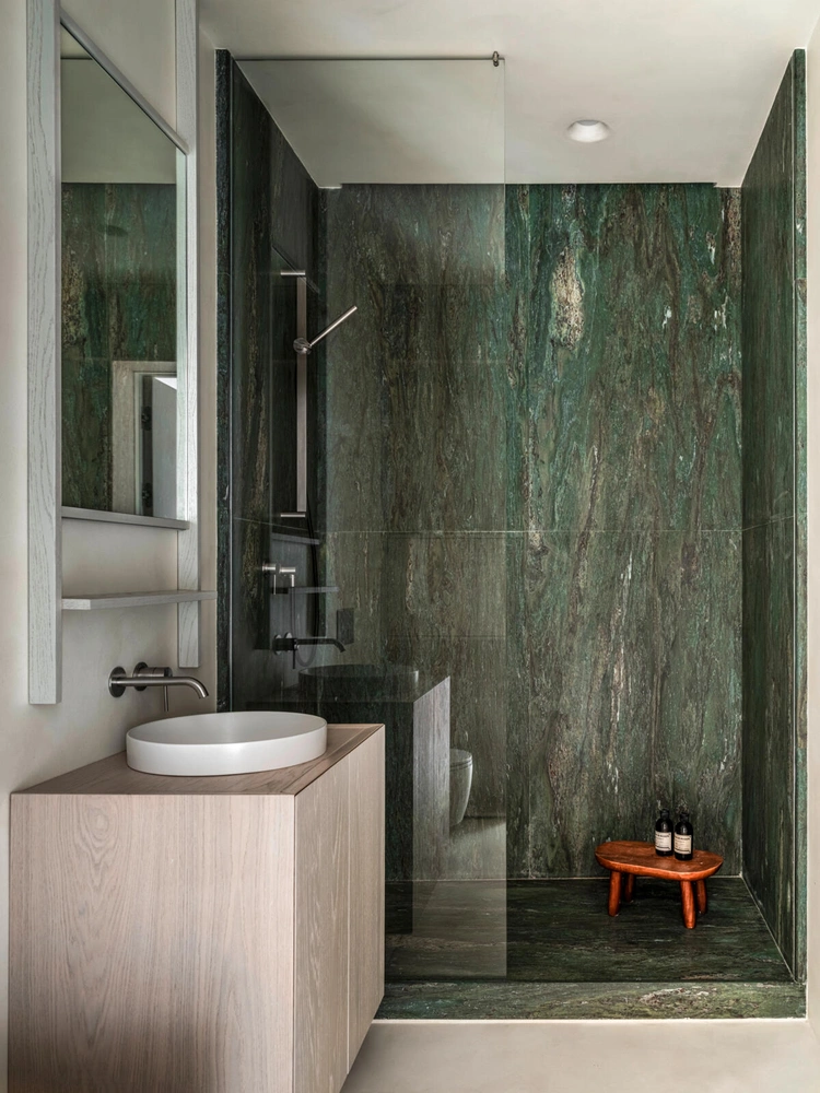 Принято считать, что темную плитку лучше не использовать в небольших пространствах, и если ваша ванная достаточно просторная, темные оттенки можно использовать для создания эффекта глубины. Но мы уверены, что такая плитка не испортит и совсем компактные душевые: здесь все-таки важна не столько площадь, сколько освещенность. Например, посмотрите на эту компактную душевую с вертикальной темно-изумрудной плиткой: благодаря окну помещение выглядит воздушным и объемным, свет подчеркивает красоту контраста светлой и темной плитки. Ее вертикальная форма тоже играет немалую роль, прибавляя высоты.