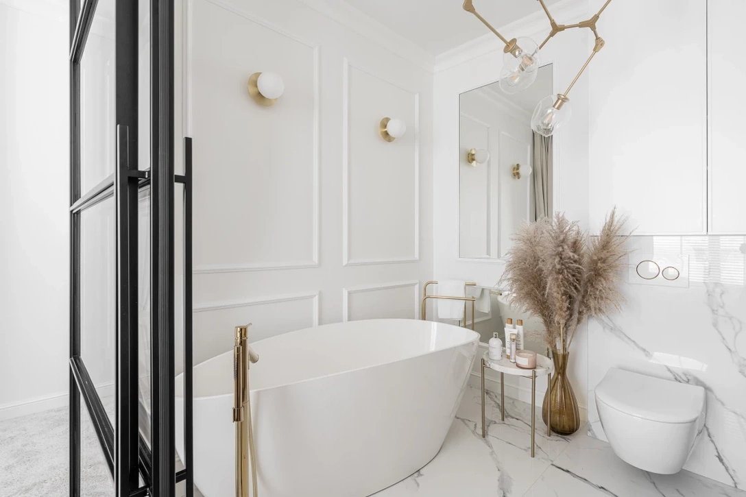 Небольшие детали вроде смесителей и держателей для полотенец на самом деле играют важную роль. Попробуйте заменить хромированные аксессуары на варианты из латуни. Вы удивитесь, как преобразится вся комната.