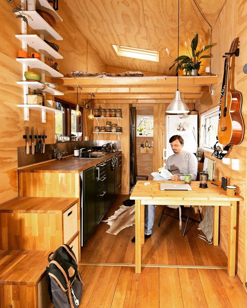 В этом коттедже на острове Малл в Шоттландии кухонный блок располагается в гостиной и спрятан за дверцами из фанеры. Плиты здесь нет — вместо нее служит печь, которая также нагревает воду в бойлере. «Владельцы дома хотели сохранить очарование этого деревенского дома, отдавая предпочтение традиционному, простому стилю», — говорит Питер Харфорд-Кросс (Peter Harford-Cross,) из студии Harford-Cross Architects. Каждая деталь кухни была тщательно продумана, чтобы максимально задействовать полезное пространство. «Под занавеской внизу спрятан миниатюрный холодильник, кастрюли и сковородки, а наверху хранится кухонная утварь и еда — они всегда на виду и под рукой», — делится дизайнер.