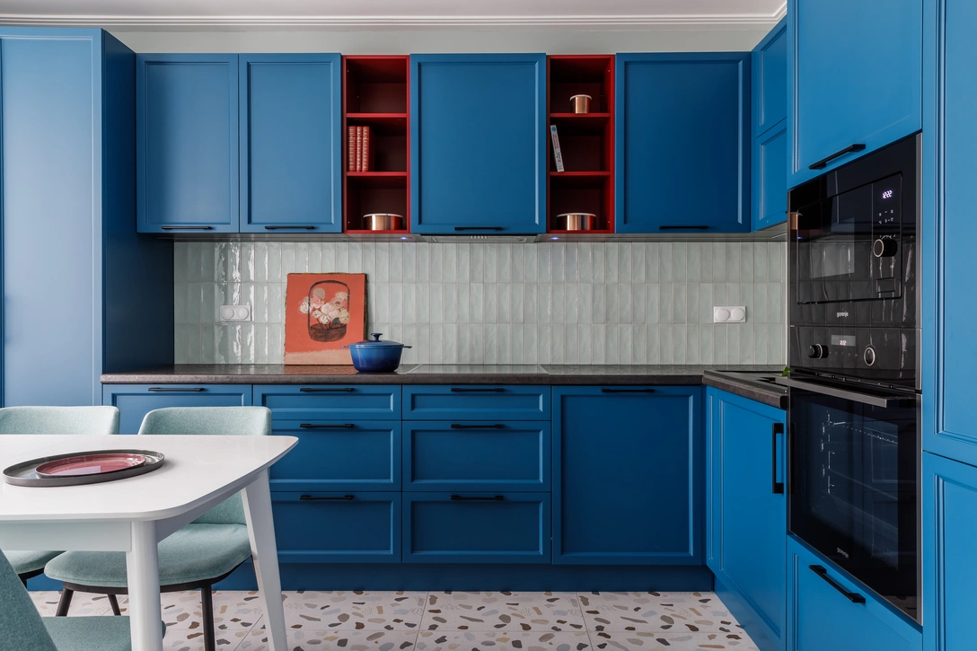 Если же синим вы решили выделить фартук, то для идеального контраста фасады можно выбрать, к примеру, белые — это будет напоминать средиземноморские интерьеры. Синий в этом случае можно также поддержать декором или цветом стола и стульев.