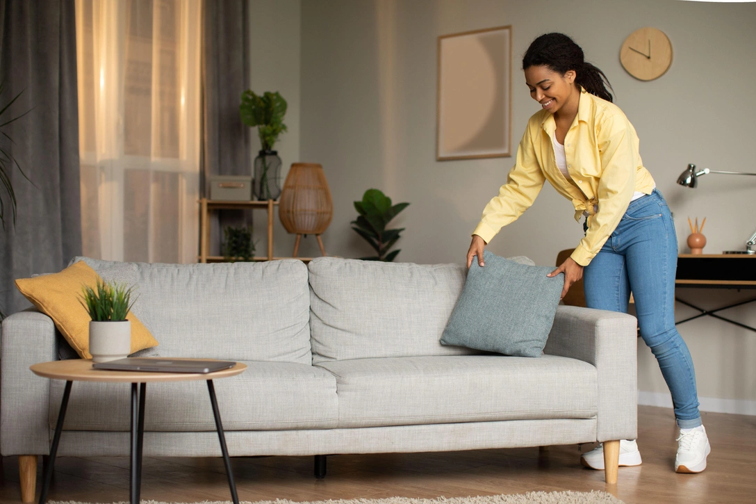 Первым делом берем в руки пылесос и тщательно пылесосим диван. Снимите подушки, если они снимаются, и почистите каждую отдельно и пространство под ними. Если нет, раздвиньте подушки руками и тщательно пропылесосьте между ними. Если у вас есть специальная узкая насадка для пылесоса — используйте ее, чтобы удалить весь сор из щелей. Также для чистки дивана отлично подходит пароочиститель. Горячий пар олично убирает грязь, пыль, пятна и запахи.