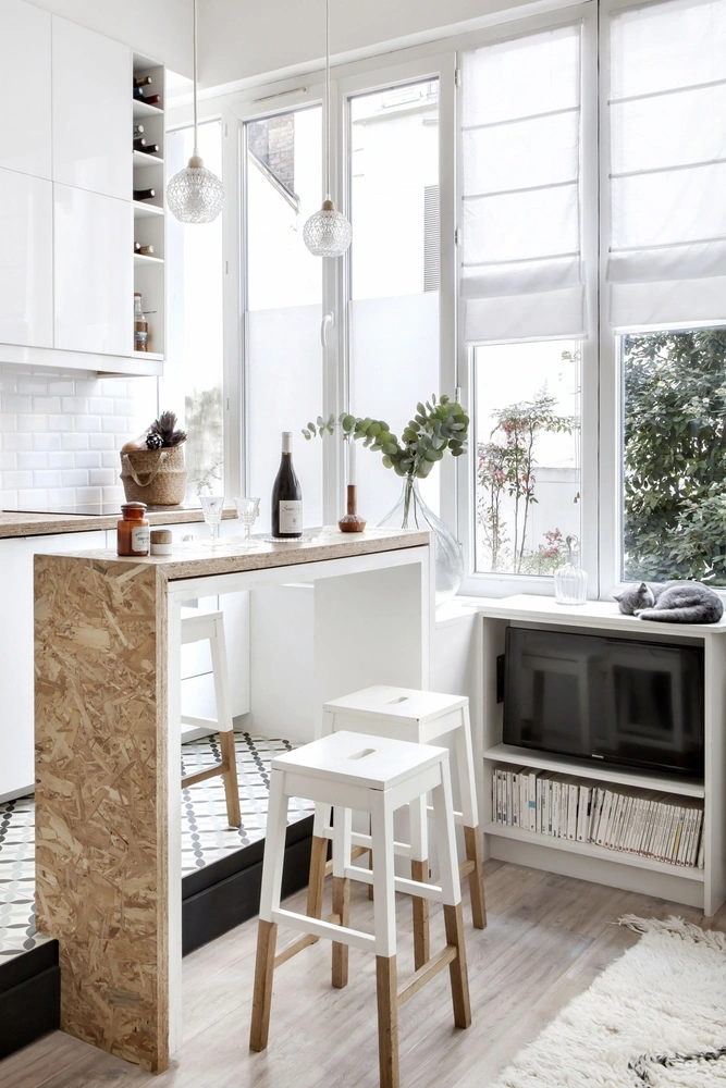 Свежо и модно смотрится фанерная кухня, интегрированная в классический интерьер