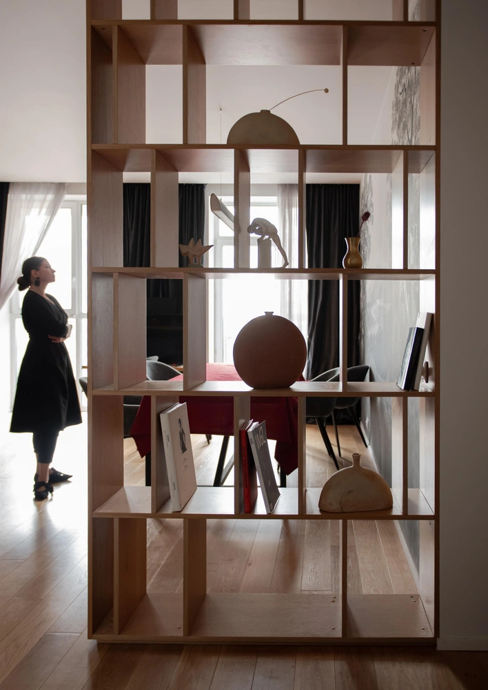 Эффектное решение — открытый стеллаж от пола до потолка. Не обязательно использовать его исключительно для книг: можно (и даже нужно!) комбинировать на полках разные виды декора. Например, поставить рядом с любимыми альбомами по искусству картины, фотографии, памятные сувениры, привезенные из путешествий, вазы, скульптуры или дизайнерскую керамику. Чем богаче экспозиция — тем привлекательнее выглядит ваша гостиная! А кроме того, всегда найдется повод для беседы с друзьями: всегда можно обсудить новую статуэтку с острова Ява или африканскую маску.