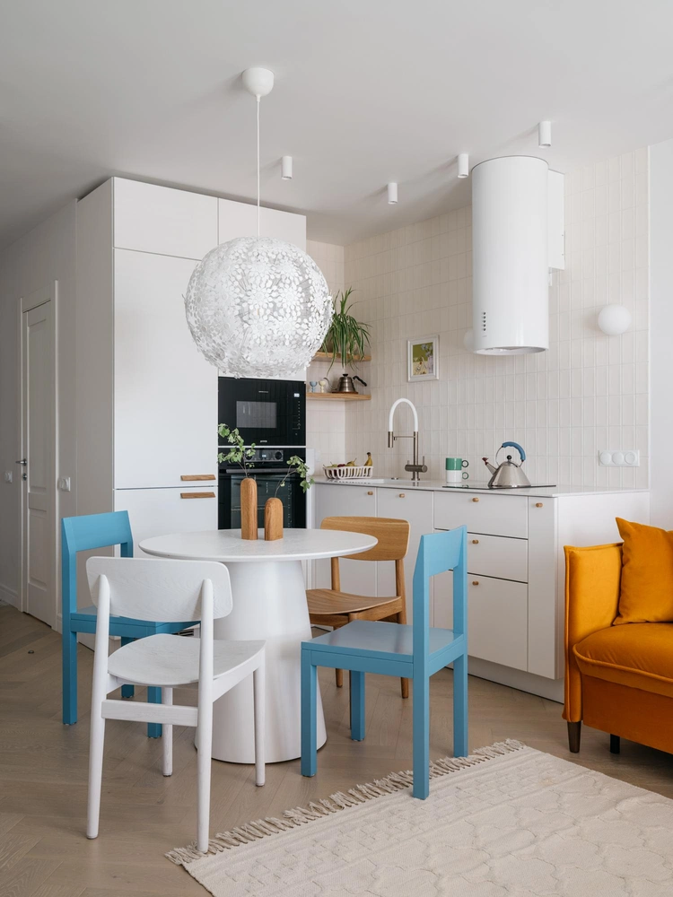 Разномастные стулья — один из трендов в оформлении столовой. Однако если вы не готовы к смелым экспериментам с формой, можно ограничиться лишь разным цветом. Примеры — в нашей подборке