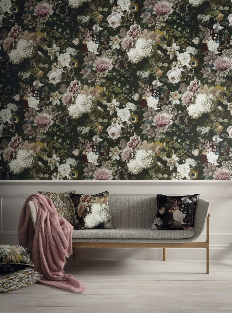 Обои Fullerton; плед и обивка дивана — ткань Mouflon Plain; подушки — ткани Felicia, Fullerton; все — Osborne & Little, магазины Manders.