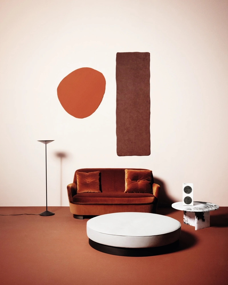 Диван Sake, дизайн Пьеро Лиссони, B&B Italia. Столики Era, дизайн Давида Лопеса Кинкосеса, Living Divani. Ваза Fide, дизайн Паолы Паронетто. Емкость Ring, Bitossi Home. Подсвечник, дизайн Хайме Айона, Fritz Hansen. Светильник IC Lights Floor 1, дизайн Майкла Анастасиадеса, Flos. Ткань Varese Terracotta, Design Guild. Ткань Camel, Alcantara.