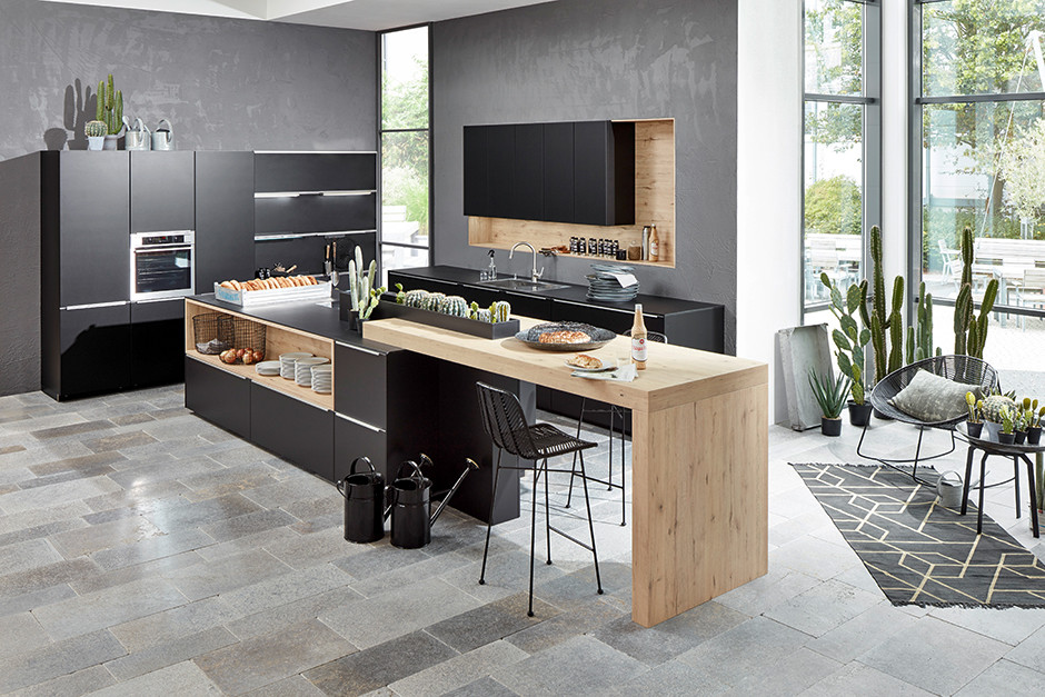 Кухонная комбинация Line + Comfort. Верхние ящики модели Line оборудованы системой автоматического открывания. Шкафы серии Сomfort отделаны белым лаком. www.hanak-nabytek.cz, салоны «Кухни Hanak», www.hanak-design.ru