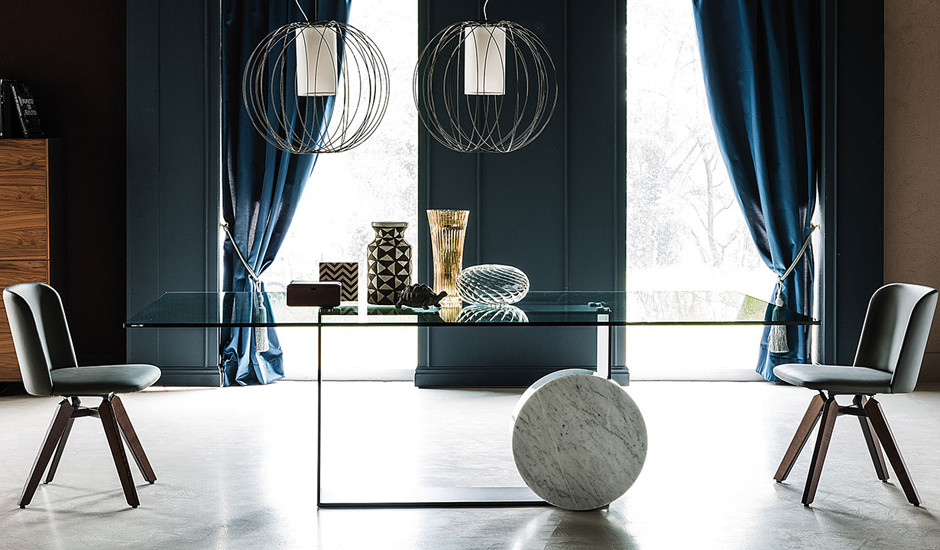 Не стол, а произведение абстрактного искусства! Дизайнер Андреа Лукателло придумал необычное подстолье. Оно состоит из стальной рамы и каменного цилиндра (он может быть выполнен из травертина или каррарского мрамора) и придает этой модели яркую индивидуальность. Столешница – закаленное стекло. Варианты отделки металла: медь, белый, графит. Отличная модель для лофта и интерьера в современном стиле.